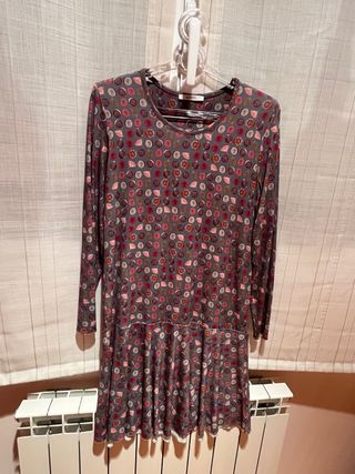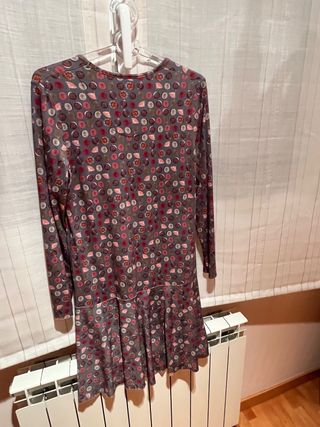 Vestido de manga larga con un estampado original de círculos y motivos florales en tonos grises y rosados. Presenta un corte evasé con una falda con vuelo. - Diseño con estampado circular. - Manga larga. - Falda con vuelo.