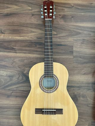 Guitarra española de tamaño juvenil, ideal para iniciarse en la música. Su diseño clásico la hace muy atractiva. - Cuerpo de madera clara. - Mástil de madera oscura. - Cuerdas de nylon.