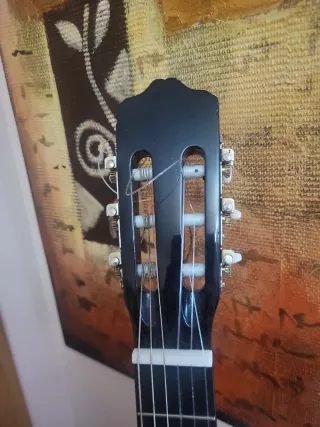 Guitarra de madera, seis cuerdas, suena muy bien.