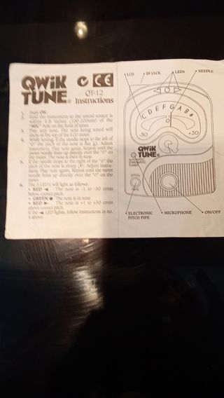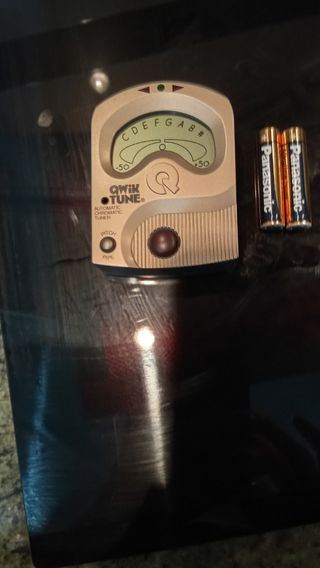 Afinador automático Qwik Tune para guitarra. Muestra las notas cromáticas y la afinación. - Pantalla LCD. - Botones de control. - Incluye dos pilas Panasonic.