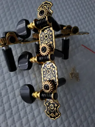 Precioso juego de clavijas para afinacio guitarra con un elegante acabado dorado y negro. El diseño detallado añade un toque distintivo al instrumento. - Acabado: Dorado y negro. - Diseño: Floral. - Tipo: Clavijas de afinación.