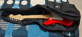 NEGOCIABLE Guitarra eléctrica de color rojo en perfecto estado ,aún con plásticos sin quitar .Comprada en arte y sonido.Se entrega con funda ,amplificador (básico) ,cable y afinador . Se cambiaría por guitarra de adulto flamenca .