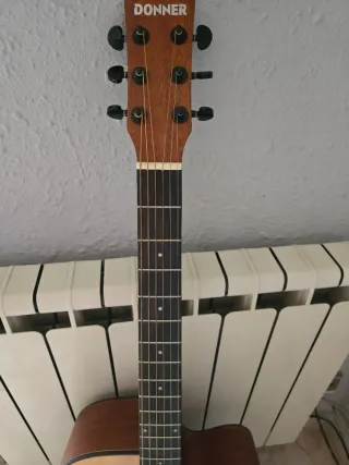Guitarra acústica Donner con un acabado natural y elegante. - Cuerpo de madera. - Mástil de madera. - Diapasón de madera. - Seis cuerdas metálicas. - Incluye púas, funda, correa, afinador, cejilla, golpeador, cuerdas extra y una llave Allen - 1 solo uso.