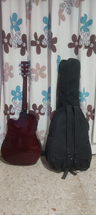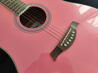 Guitarra acústica de color rosa, ideal para principiantes o aficionados. Se incluye funda para su transporte y protección. - Color rosa vibrante. - Diseño acústico clásico. - Incluye funda.