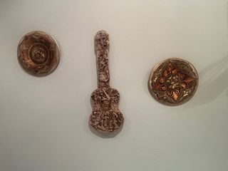 Conjunto de tres adornos decorativos para colgar en la pared. - Un adorno central con forma de guitarra tallada. - Dos adornos circulares con diseño grabado.