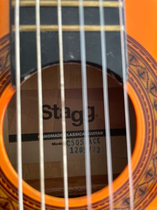 Guitarra clásica Stagg C505 de tamaño 1/4, ideal para los más pequeños. - Cuerpo de color naranja brillante. - Mástil de madera oscura. - Seis cuerdas de nylon. - Clavijero metálico. - Funda incluida