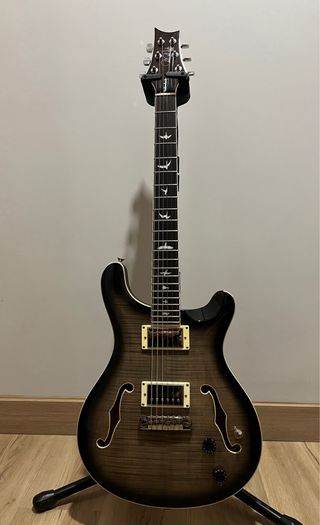 Guitarra eléctrica PRS SE Hollowbody del año 2019. Un instrumento con un diseño elegante y versátil. - Cuerpo hueco. - Acabado degradado oscuro. - Incrustaciones de pájaros en el mástil. - incluye estuche - no cambios - excelente estado, ni golpes ni marcas