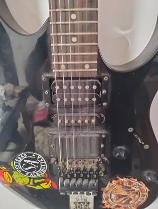 Guitarra eléctrica Ibañez GRG270 en color negro. Presenta un diseño moderno y es ideal para guitarristas. - Acabado brillante. - Cuerpo de madera. - Diapasón de palisandro. - Pastillas dobles (humbucker). - Trémolo. - Pegatinas decorativas.