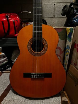 Guitarra española clásica en muy buen estado. Ideal para iniciarse o para músicos que buscan un instrumento de calidad. - Tapa de madera. - Mástil de madera. - Diapasón de madera - Cuerda rota lo único - Funda clásica.