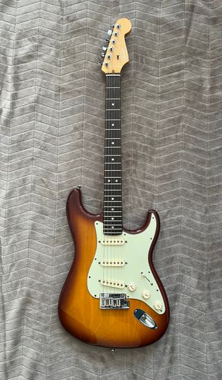 60th Anniversary (Tobacco Sunburst) SSS Moderna y versátil. Súper cómoda. Vendo por falta de uso. Pastillas NS-3. Botón S-1 (en serie a paralelo), hasta 10 combinaciones de sonido. Mástil de radio compuesto (9.5"-14") muy cómoda y bendings sin trasteos. Clavijas de bloqueo. Puente moderno. No sé, las specs de las American Deluxe. El acabado no se precia bien en las fotos, es muy bonita. Precioso veteado de la madera. Los trastes están bien. Tienen un poco de desgaste del uso normal. Estuche original Fender ABS negro. Desconchón considerable en esquina que me dieron en un teatro (foto), pero cierra y cumple perfectamente. Contáctame!