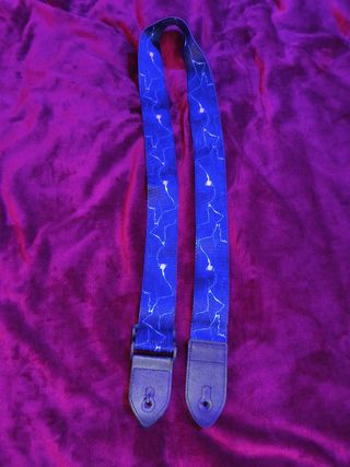 Correa para guitarra con un llamativo diseño de rayos en azul. - Longitud máxima de 132 cm. - Incluye accesorio para guitarra y dos protectores de goma. Nuevo, sin usar!!! Mira mi muro, porque hay más cosas de guitarra. (Por ahora).