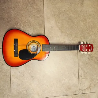 Guitarra española de tamaño reducido, ideal para niños que se inician en la música. Su diseño es atractivo con un acabado degradado en tonos naranjas y rojos. - Cuerpo de madera. - Mástil con trastes marcados. - Clavijero metálico. - Cuerdas de nylon. - Funda.