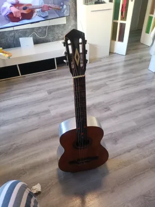 Guitarra clásica de tamaño pequeño, ideal para principiantes. Se encuentra en buen estado, lista para tocar. Le falta la última cuerda y lo q hace q afine dicha cuerda.Las 2 cosas baratas y fáciles de encontrar de ahí pido lo q pido. - Cuerpo de madera. - Diapasón en buen estado. - Perfecta para aprender.