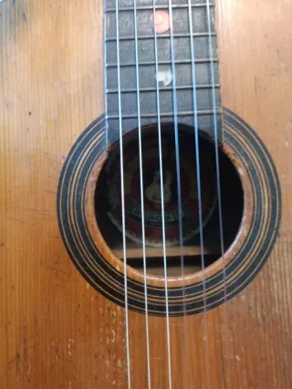 Guitarra antigua con un diseño tradicional. Esta el diapasón un poco curvado. Es bastante antigua y se nota.