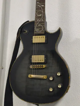 Guitarra eléctrica con un diseño inspirado en el estilo Les Paul. Su acabado le da un aspecto único. - Cuerpo con acabado degradado. - Incrustaciones decorativas en el mástil. - Herrajes dorados. - pastillas HB Seymon Durcal Única