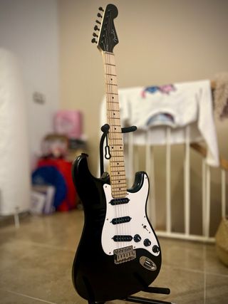 Guitarra eléctrica Squier modelo Strat by Fender. Está en muy buen estado y lista para tocar. - Incluye una guitarra eléctrica Squier Stratocaster. - Color negro brillante. - Mástil de madera de arce. - Pastillas de bobina simple.