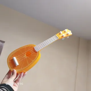 Divertida guitarra ukelele con diseño de naranja. - Cuerpo con forma de gajo de naranja. - Mástil y clavijas de color amarillo. - Cuerdas de nylon.
