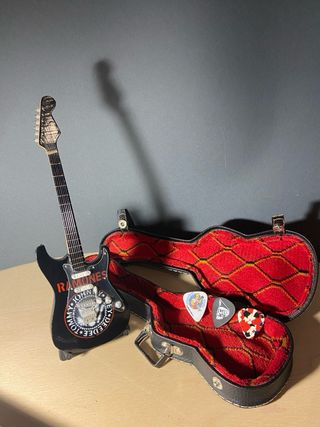 Colección de miniaturas de guitarras, perfectas para los amantes de la música y los objetos de colección. - Guitarra estilo Jack Daniel's. - Guitarra estilo Ramones. - Incluye una funda para la guitarra, y un soporte para la otra Puedes usar la funda de la guitarra para guardar las púas, mega guay De regalo una de las púas, la que tu elijas!!!
