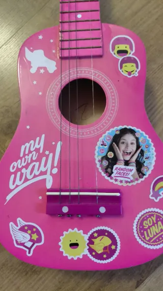 Guitarra infantil de color rosa, decorada con divertidas pegatinas. - Diseño llamativo con unicornio, arcoíris y personajes. - Texto my own way! y Soy Luna en la caja. - Ideal para iniciarse en la música. -LE FALTAN DOS CUERDAS.