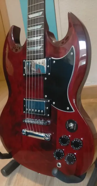 SG vintage con mejoras, y convertida en réplica Gibson. Electrónica nueva y mejorada, con apantallamiento. Pastillas probucker custom alnico. Cuerpo y mástil de caoba. Clavijero vintage tipo kluson. Cejuela de hueso. Calibrada y quintada. mástil repasado por luthier, con inlays añadidos.lista para tocar. Está impecable. Solo rasguño debajo de clavijero poco visible. Tiene un sonido brillante y potente. Puedo enviar vídeos y más fotos. Se puede probar y hago envíos por correos en caja rígida.