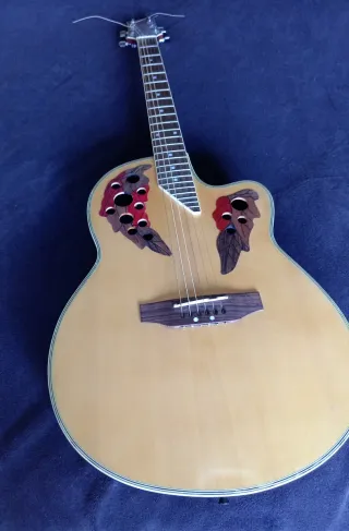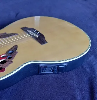 Guitarra electro-acústica con un diseño distintivo. - Cuerpo con múltiples orificios decorativos. - Acabado en color natural. - Mástil de madera.