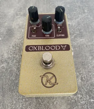 Pedal de guitarra Oxblood con acabado en color beige y detalles en burdeos. Presenta tres potenciómetros para ajustar el nivel, tono y drive, además de un interruptor para el clipping. - Controles: Level, Tone, Drive. - Selector: Phat, Clipping. - Diseño: Oxblood con logo. - Interruptor: Footswitch.