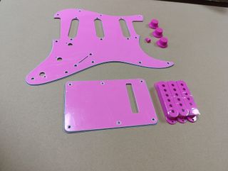 Conjunto de accesorios para guitarra Stratocaster en color rosa. - Golpeador SSS. - Tapa trasera. - 3 botones de control. Dos tonos y un volumen - 1 punta de selector. - 3 cubiertas para pastillas single coil. Distancia entre polos 50mm