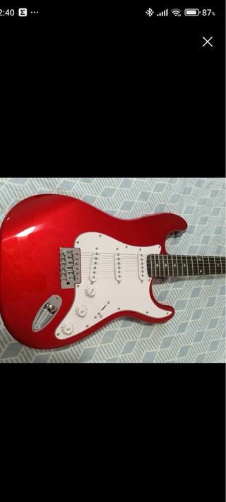 Guitarra eléctrica de la marca MUSICOOL, de color rojo brillante. - Cuerpo de guitarra eléctrica. - Color rojo metálico. -Tipo Stratocaster. La guitarra es en general bien construida y pesa muy poco. Lo mejor que tiene son las pastillas que la hacen sonar de forma expectacular. Ragalaria funda acolchada La compre para un regalo pero no llego a termino y yo ya tengo varias asi que con aduanas me costo 302€ y la doy en 190. Tengo factura de guitarra y aduanas