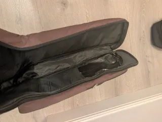Funda de color marrón para guitarra eléctrica. Tiene un bolsillo frontal con cremallera y asas para su transporte. - Cremalleras funcionales. Tiene rasgada la parte superior donde va el clavijero, de ahí su precio (nueva son 30€).