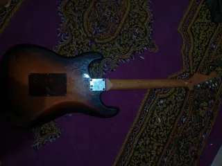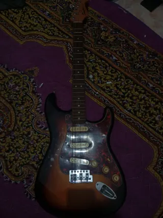 Guitarra eléctrica con acabado sunburst. - Cuerpo de madera. - Mástil de madera clara. - Placa de unión del mástil metálica. Tiene una cosa mal y esque le faltan 2 cables de los 6 que hay para tocar pero eso no es un problema porq igual toca bien