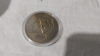 Conjunto de dos monedas conmemorativas dedicadas a Elvis Presley. - Una moneda presenta el retrato de Elvis Presley con su firma y una guitarra. - La otra moneda muestra una escena de Elvis Presley tocando la guitarra, con la inscripción THE KING OF ROCK 'N ROLL y las fechas 1935-1977.