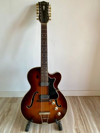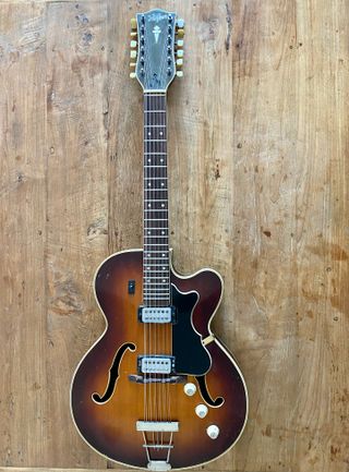 Rareza, por su antigüedad, por su estado y por su sonido, único e incomparable con cualquier otra 12 cuerdas que conozca. Todo es original salvo el puente, una clavija y la electrónica, sustituida para mejorar el rendimiento de las humbuckers Höfner originales; se conserva la electrónica original. Ajustada por el reconocido lutier Broussole en Barcelona. Ideal para jangle pop de los 60, folk rock y psicodelia. Sonido brillante para arpegios, acordes abiertos y solos, responde muy bien overdrive, delay y reverb. Acabado sunburst clásico.