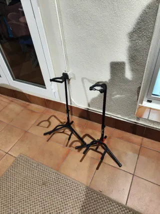 Se venden dos soportes para guitarra, ideales para mantener tu instrumento seguro y accesible. Son plegables y fáciles de transportar. - Color negro. - Diseño estable con patas. - Ajustables en altura.