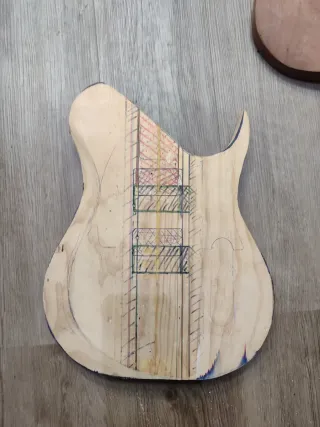 Pieza de madera sin terminar, ideal para proyectos de luthería. Madera de rad8ata - Forma angular distintiva. - Marcas de guía para componentes. - Material de madera sin tratar.