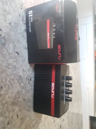 Amplificador de guitarra compacto SCURU S1. - Diseño moderno en color negro con detalles rojos. - Controles de volumen y tono. - Ideal para practicar en casa. 14×10×8 cm