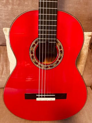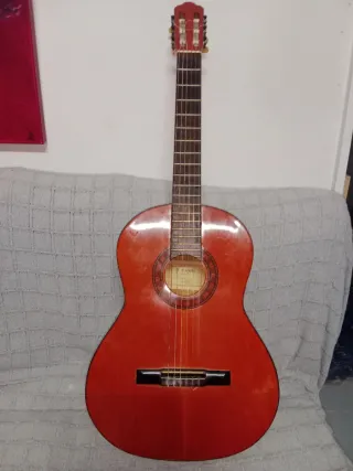 Guitarra clásica de color naranja, ideal para iniciarse en la música. - Cuerpo de madera brillante. - Mástil con trastes marcados. - Clavijero dorado. Reparado Escucho ofertas