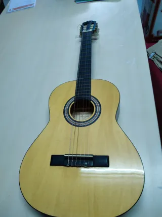 Guitarra española clásica de tamaño estándar. Ideal para iniciarse en el aprendizaje musical. - Cuerpo de madera clara. - Diapasón oscuro con trastes. - Clavijero metálico. - Cuerdas de nylon.