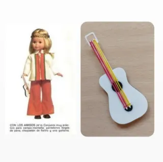 Guitarra del conjunto "Con los amigos" de Nancy. Un accesorio reproducido a partir del original con impresión 3D para transportarnos de lleno a aquellas tardes de juegos, conciertos improvisados y sueños a lo grande. Perfecta para completar tu conjunto vintage y revivir la magia de una época inolvidable. Envío a través de Wallapop o correos ordinario (1,15€) o certificado.