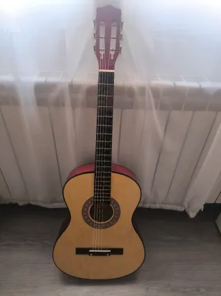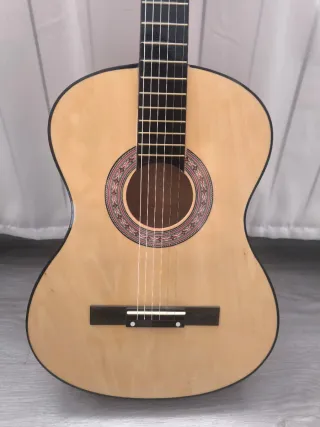 Guitarra clásica de color madera, ideal para iniciarse en la música. - Cuerpo de madera. - Diapasón con trastes. - Cuerdas de nylon.
