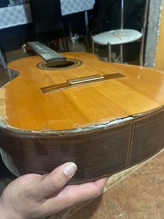 Guitarra clásica de madera con detalles en el mástil y el cuerpo. - Tapa de madera clara. - Aros y fondo de madera oscura. - Mástil con trastes visibles. Lo unico que tiene es esa raja que tiene arreglo