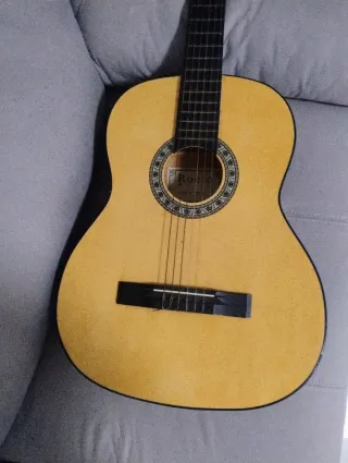 Guitarra española clásica con un acabado brillante y cálido. Ideal para principiantes o aficionados. - Cuerpo de madera. - Diapasón de madera oscura. - Cuerdas de nylon. Sonido potente y contínuo con un tono claro y transparente! Está sin usar Regalo la funda! Y curso completo para aprender a tocar la guitarra, con un segundo cuaderno de canciones con tonos para que ejercites las enseñanzas adquiridas Todo un REGALAZO! VENTA EN PERSONA, NO SE ENVÍA
