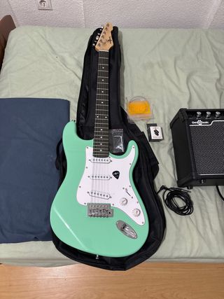 Pack completo de guitarra eléctrica en color verde menta, ideal para iniciarse. Incluye amplificador y accesorios. - Guitarra eléctrica con funda. - Amplificador. - Cable de conexión. - Púas. - Cuerdas de repuesto.