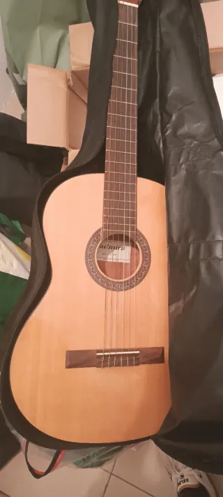Guitarra clásica española con un acabado de madera natural. - Marca “Admira Málaga” - La compré en la tienda “Javier Musical” nueva para ir durante 3 meses a un curso de guitarra española. - La vendo porque no la uso, esta perfecta y voy a efectuar una mudanza. - Envío fotos y videos sin problema alguno. - Incluyo púas, afinador electrónico, mochila específica para la guitarra y archivador de partituras. - Precio negociable.