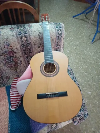 Guitarra acústica española de la marca ROCIO. Ideal para iniciarse en la música. - Cuerpo de madera clara. - Diapasón con trastes. - Cuerdas de nylon. Me tocó en un sorteo y nunca ha sido usada.
