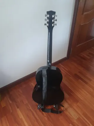 Guitarra acústica en buen estado, lista para ser tocada. - Cuerpo de madera clara. - Diapasón oscuro con marcadores de posición. - Clavijero negro con afinadores plateados. - Golpeador negro. - Soporte para guitarra incluido.