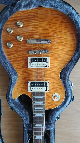 Epiphone Slash Limited Edition 2010, también conocida como la Epiphone Slash "Appetite" Les Paul Standard Limited Edition. Características Principales: Producción Limitada: Solo se fabricaron 3.000 unidades en todo el mundo. Pastillas Seymour Duncan: A diferencia de otras Epiphone, este modelo venía equipado con pastillas reales Seymour Duncan Slash Alnico II Pro. Maderas de Calidad: cuerpo de caoba con un fondo de una sola pieza y tapa de arce flameado Grado AAA. Perfil del Mástil: Mástil de caoba,perfil Slash Custom años 60. Se incluye estuche rígido original. La puedo enseñar en Vitoria,Bilbao o alrededores.