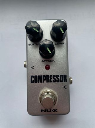 Pedal de guitarra Nux Compressor en acabado plateado. - Tres perillas de control: Sustain, Level y Attack.