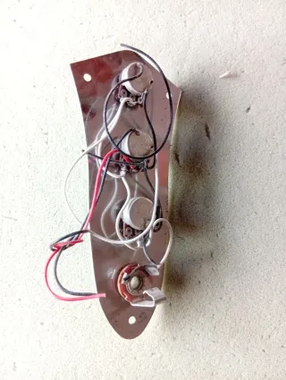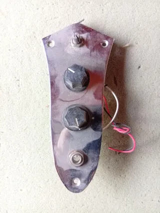Placa de control para bajo eléctrico con potenciómetros, le falta una de perillas o knobs de plástico. Marca genérica. - Placa metálica cromada. - Dos potenciómetros negros. - Un jack de entrada.