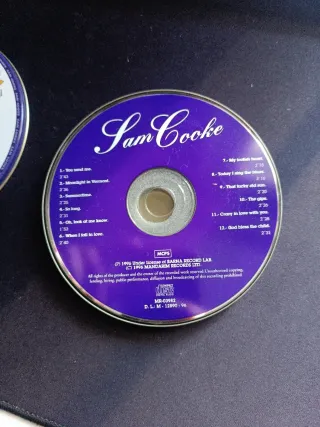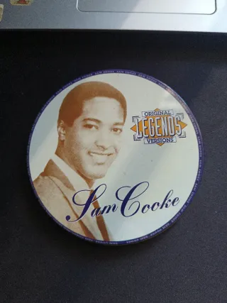 CD metálico con la música de Sam Cooke, parte de la colección Original Legends. - Diseño circular con imagen del artista. - Borde con repetición del nombre Sam Cooke.