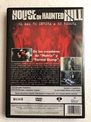 Película de terror y suspense House on Haunted Hill en formato DVD. - Idiomas: Inglés y Español. - Género: Terror, Suspense.